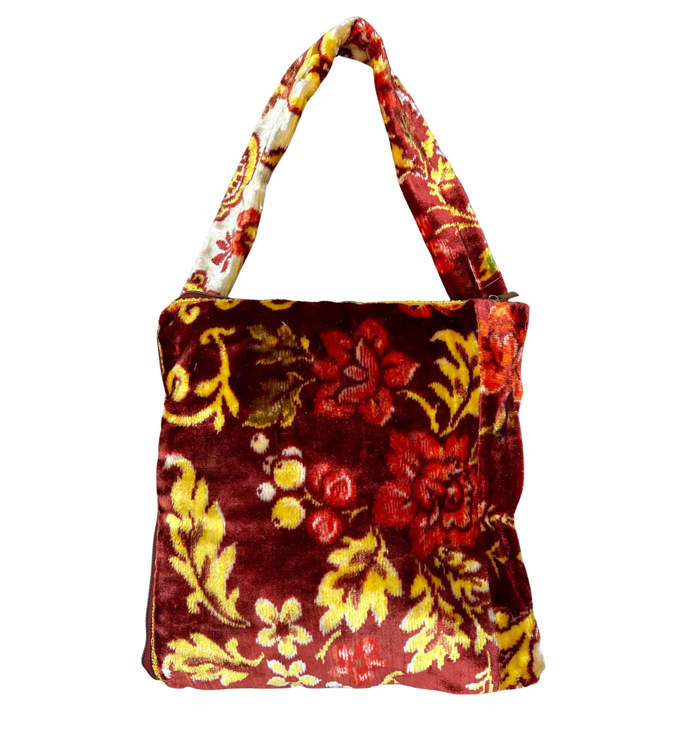 Derin bordo zemin üzerinde altın yapraklar ve kırmızı çiçek motifleri ile işlenen kadife, eski dünya berraklığı ve pelüş hacmiyle dikkat çeker. Kollar boyunca daha yumuşak krem tonları ve ilave çiçek motifleriyle katmanlı bir kompozisyon oluşturulmuştur. Etek ucundaki dokulu dokuma şeritler ve saçak, duvar halısını korunmuş bir tekstil artefaktı gibi çerçeveler.