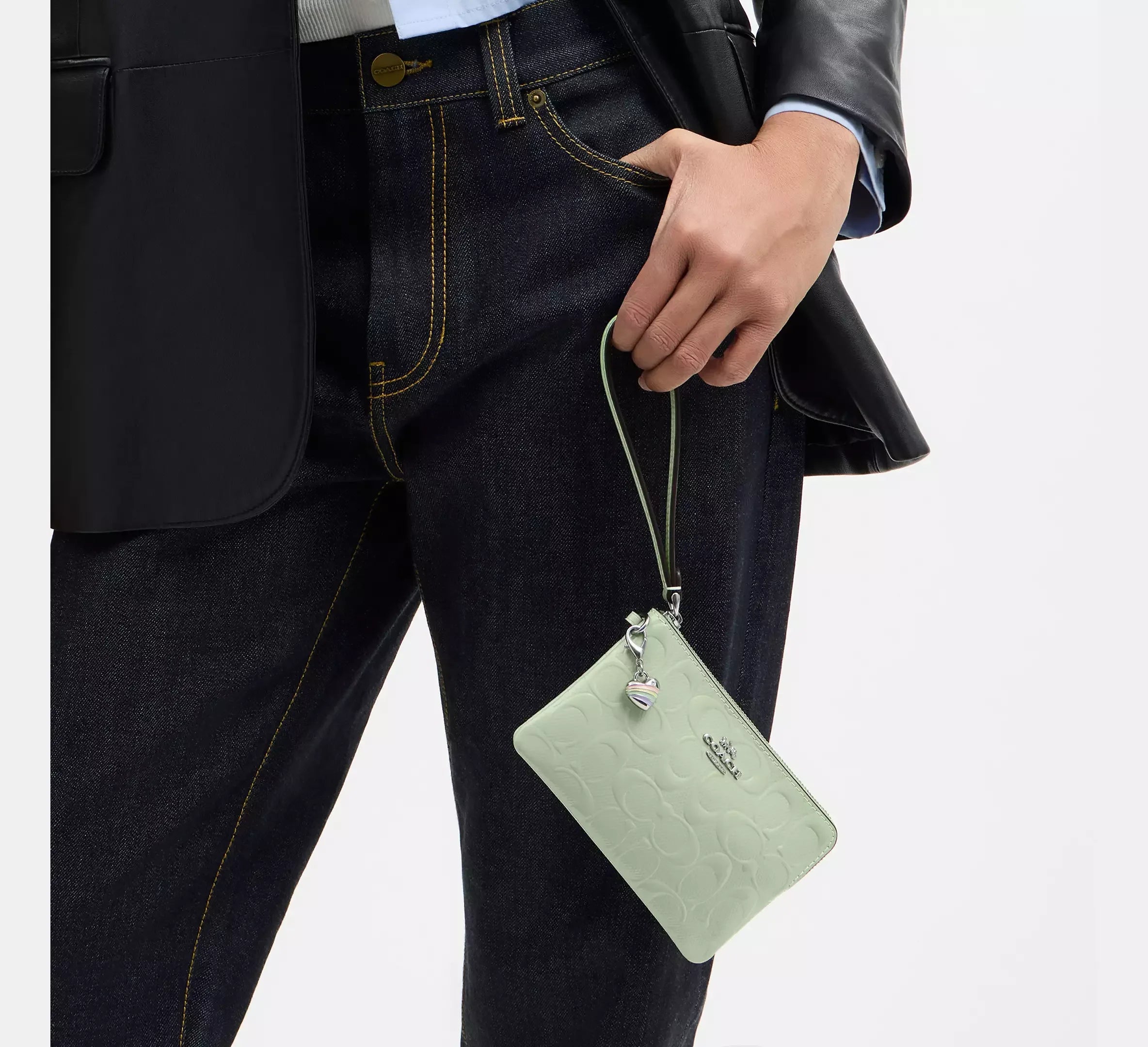 Coach Corner Zip Wristlet In Signature Leather With Heart Charm – Silver/Pale Green