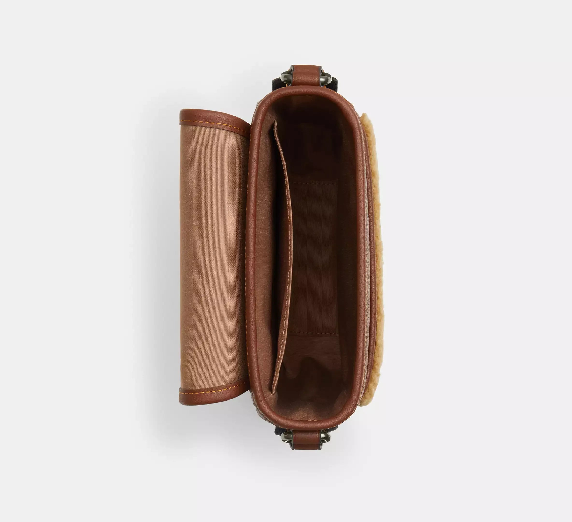Bu çanta, hem estetik hem de fonksiyonellik açısından mükemmel bir denge sunar. Signature kaplamalı kanvas, rafine dana derisi ve yumuşak koyun yünü (shearling) gibi seçkin malzemeler, el işçiliği ile bir araya gelerek zarif bir görünüm oluşturur.