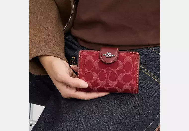 Coach Medium Corner Zip Wallet In Signature Denim – Silver/True Red