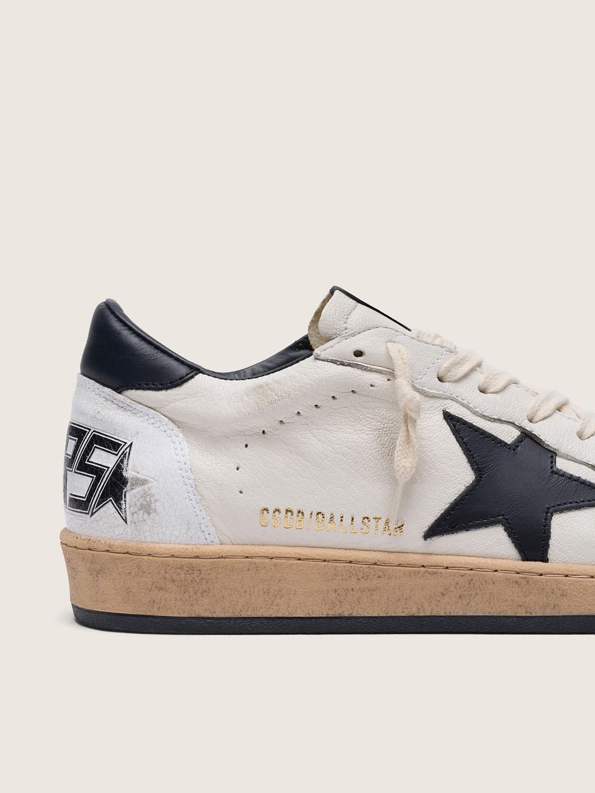Üst kısım beyaz nappa deri üzerine siyah deri yıldız ve siyah deri topuk etiketi gibi kontrast detaylarla tasarlanmıştır; arka ve ön kısımda beyaz çatlak deri insertleri bulunur. Üretimde kullanılan malzemelerin birleşimi ve vintage finisaj, ayakkabının hem estetik hem de el işçiliği açısından dengeli görünmesini sağlar. Krem bağcıklar ve dikkatli dikiş detayları, tasarımın bütünlüğünü tamamlar.