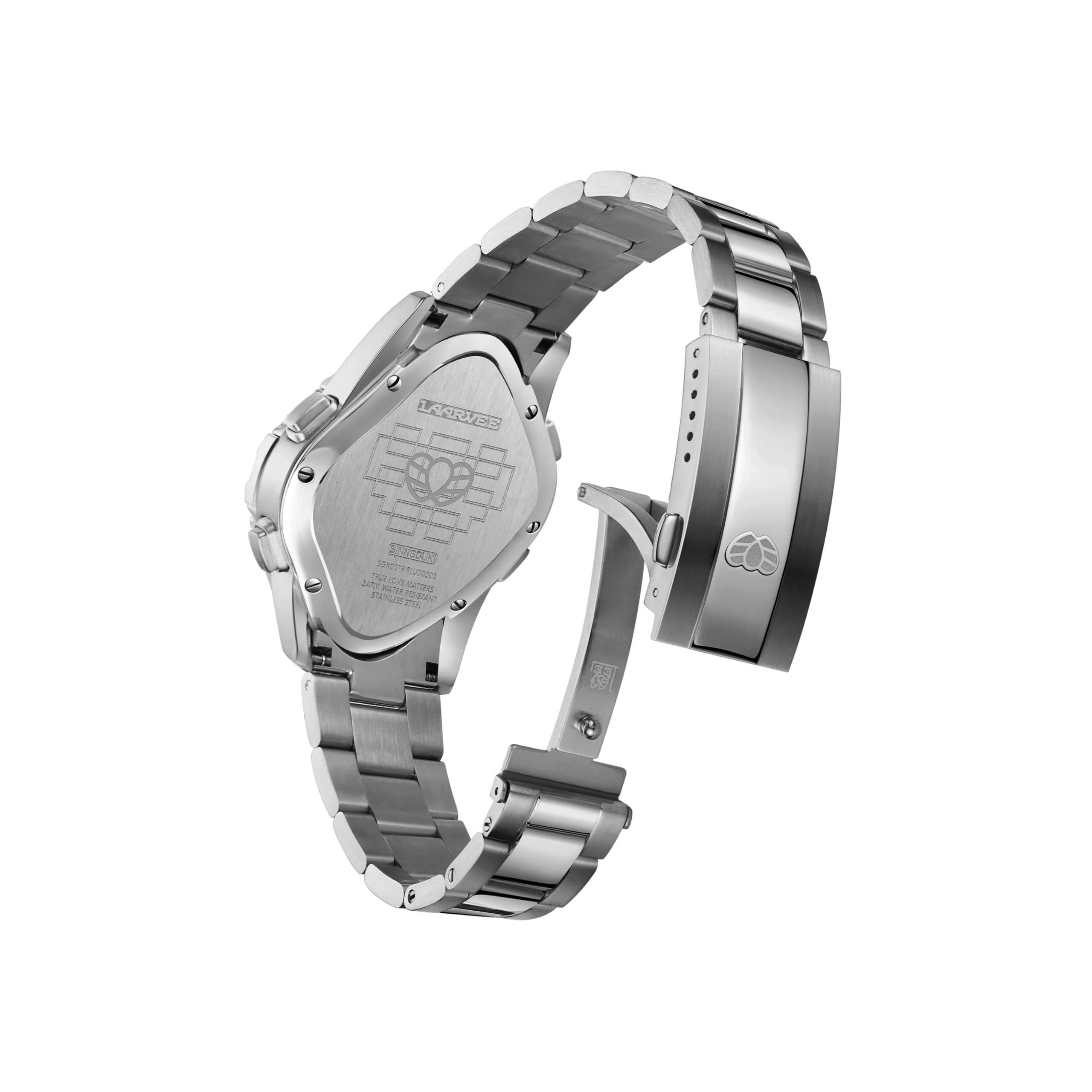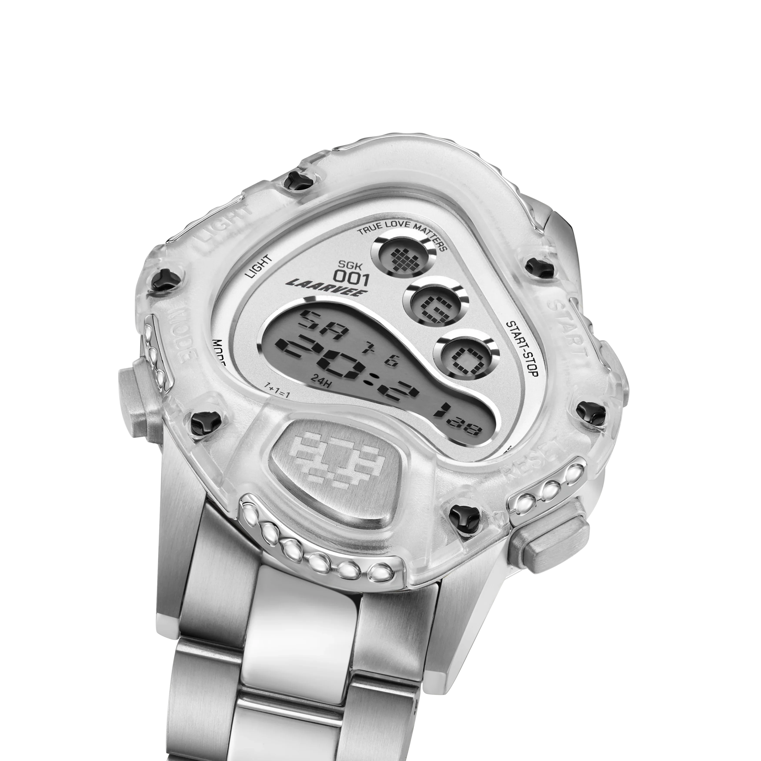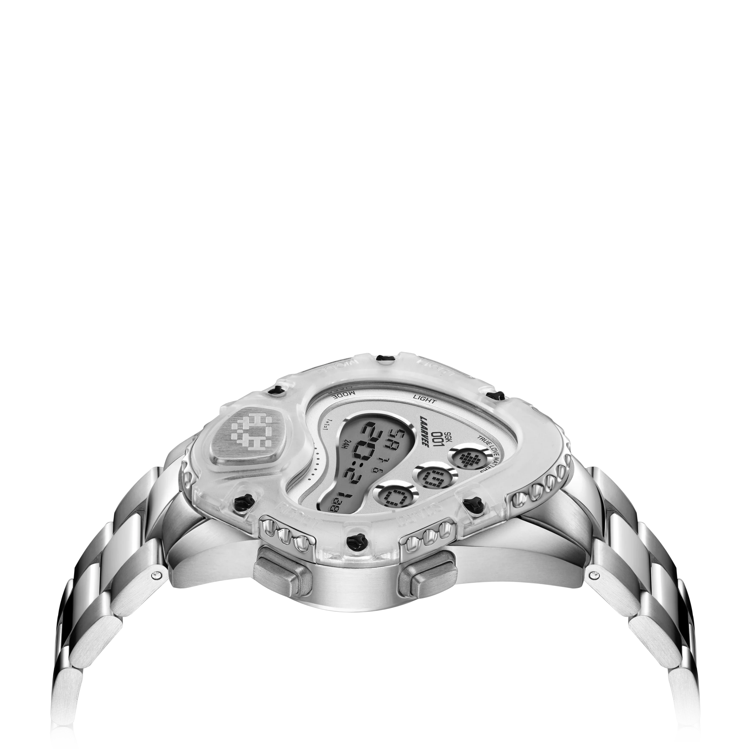 Laarvee'nin imza tarzıyla tasarlanan SGK001R-PBTRWHTSVR, bozulmuş LCD ekranı ile dijital hassasiyeti heykelsi formla birleştiriyor. Bu dijital saat, geleneksel saat yapımı ile çağdaş sanatı bir araya getirerek yeni bir dönemi başlatıyor.