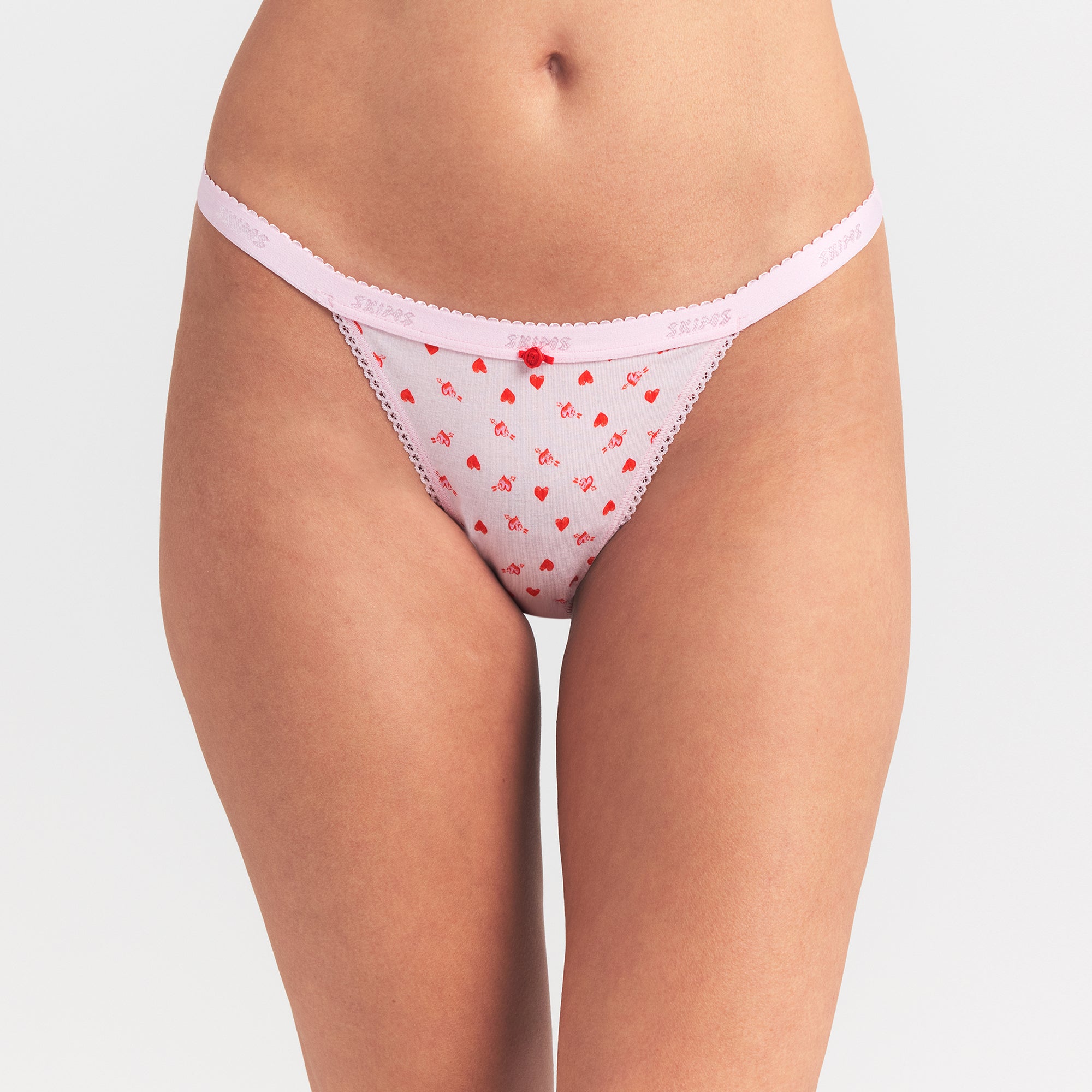 SKIMS LIGHTWEIGHT COTTON LOGO PICOT STRING BIKINI | BABY PINK ARROWED HEARTS