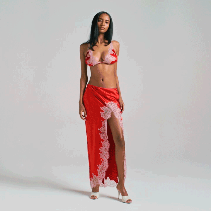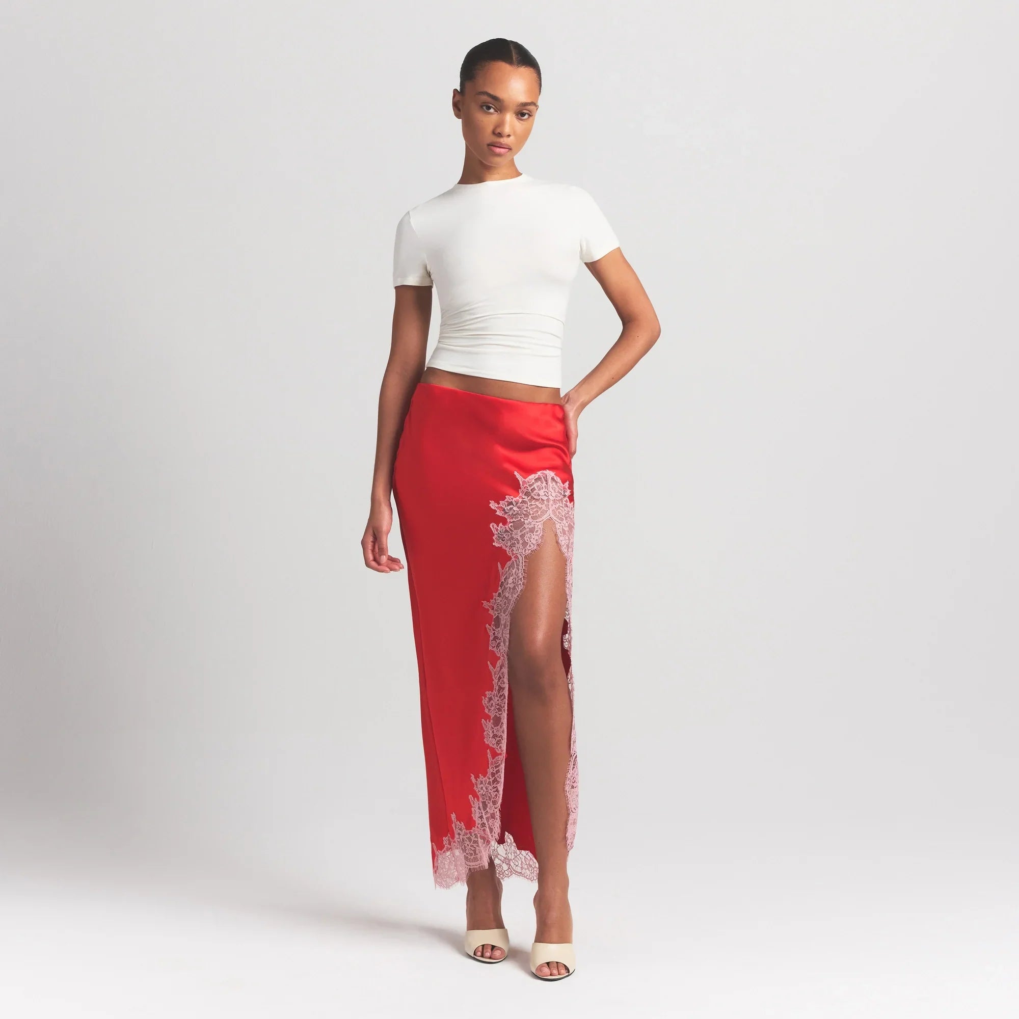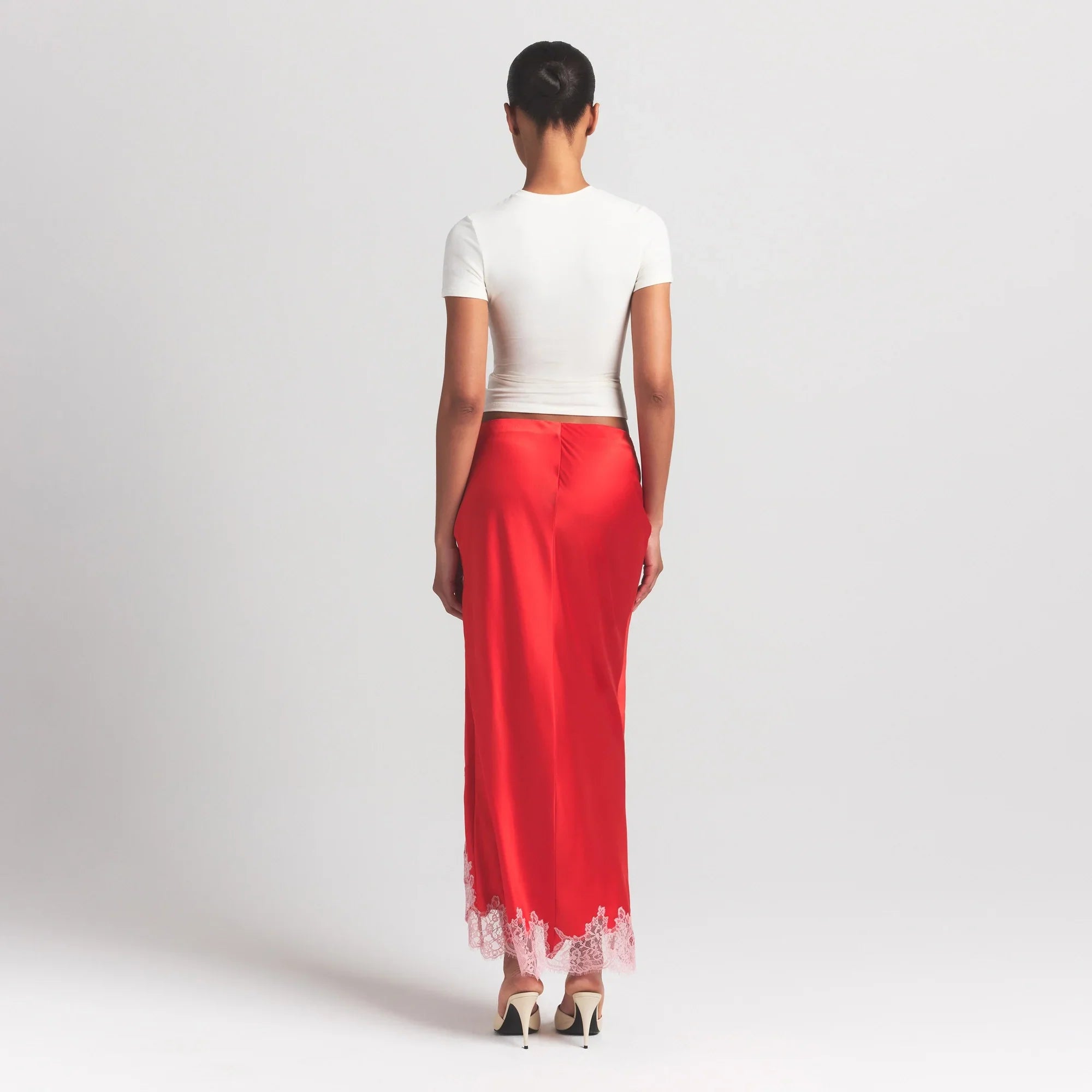 SKIMS SILK LACE SLIP MIDI SKIRT | RUBY CONTRAST