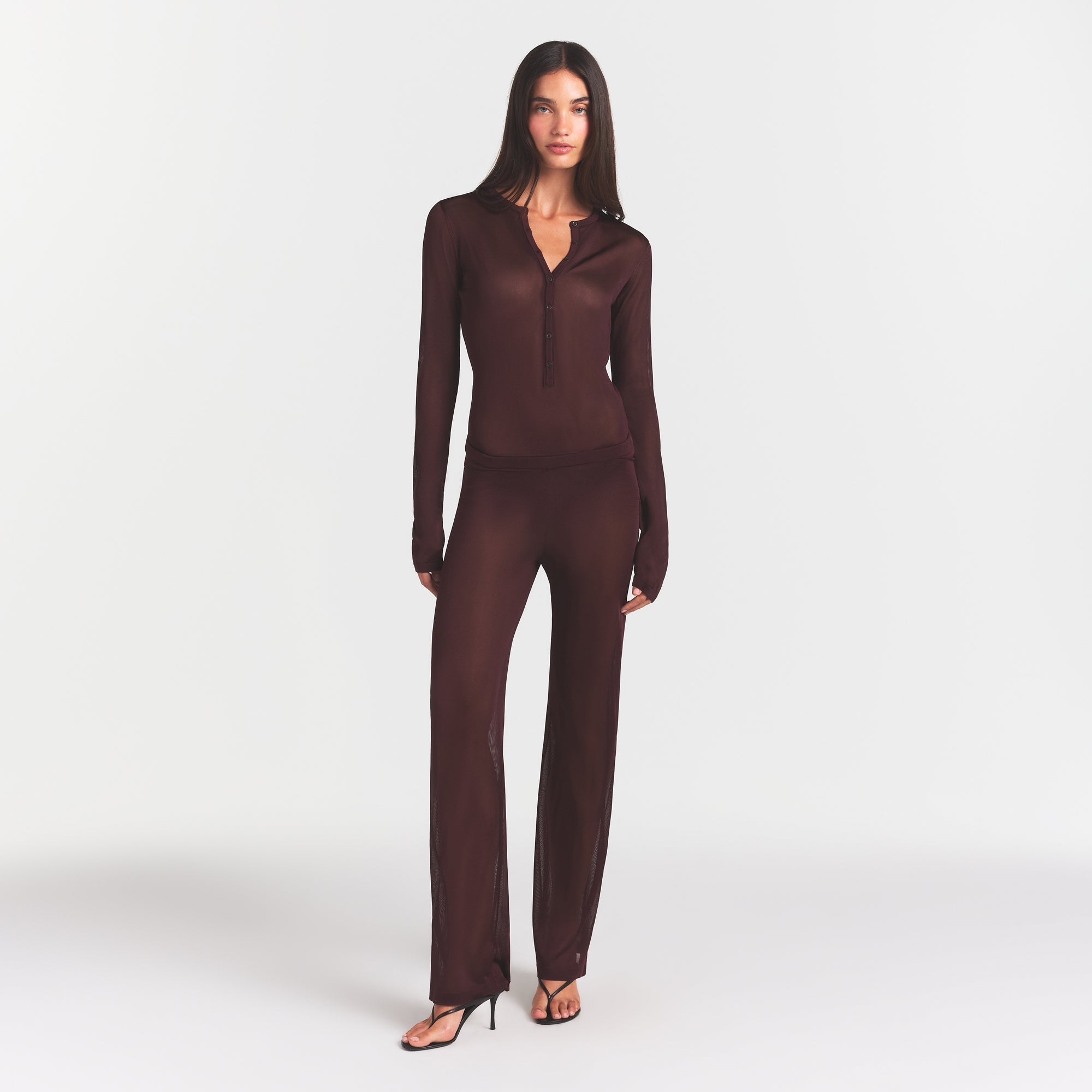 SKIMS SLINKY KNIT BUTTON UP HENLEY ONESIE | CURRANT