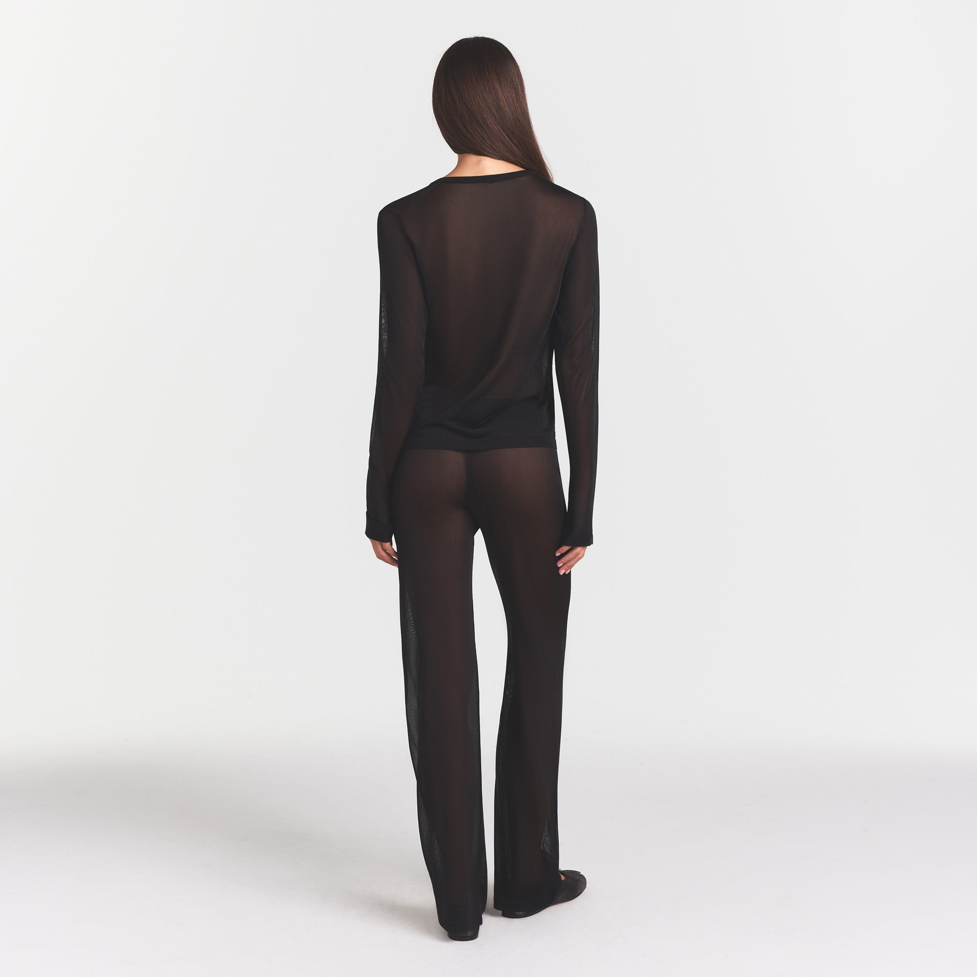 Şeffaf bir temel parça, sizin tarzınıza göre şekillendirildi. Katmanlı giyilmek veya tek başına kullanılmak üzere tasarlanan bu yuvarlak yaka uzun kollu üst, yeni zarif Slinky Knit kumaşımızla cesur bir çekicilik sunuyor.