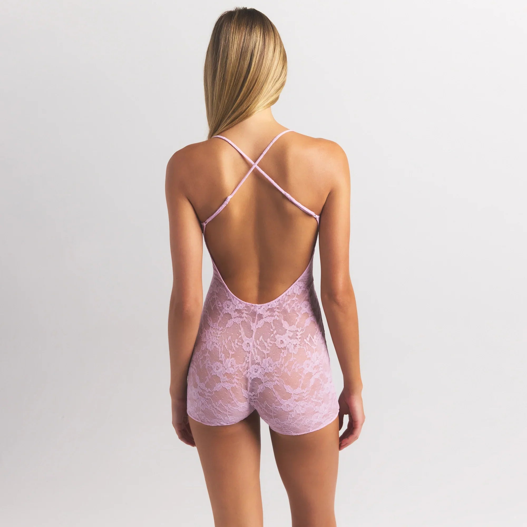 SKIMS STRETCH LACE LOW BACK ONESIE | BABY PINK