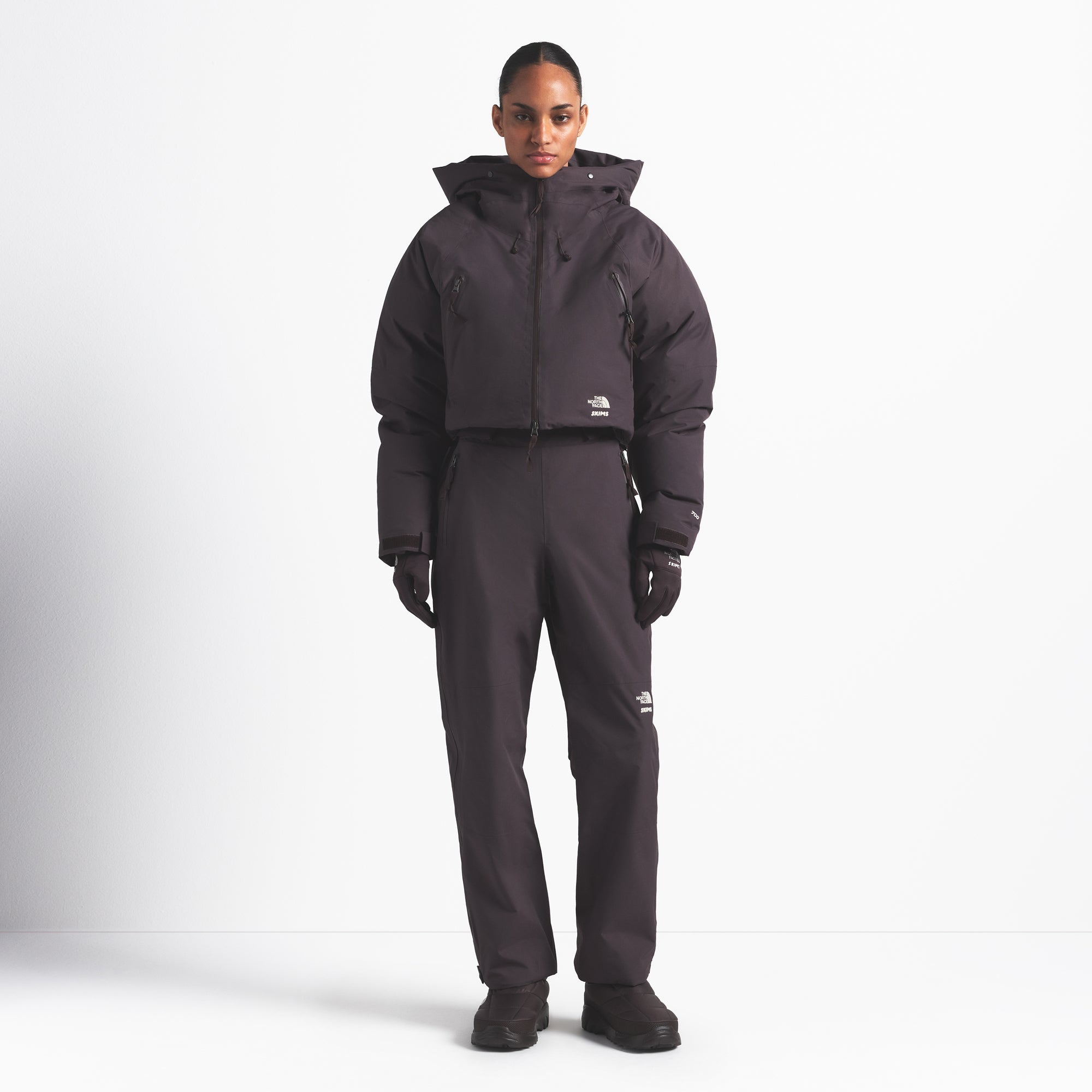 Bu performans ceket, SKIMS'in imza renkleriyle şık bir kısa siluete sahiptir. Soğuk havalarda maksimum sıcaklık sağlamak için tasarlanmış, sınırlı sayıda üretilen The North Face x SKIMS Koleksiyonu'na aittir.