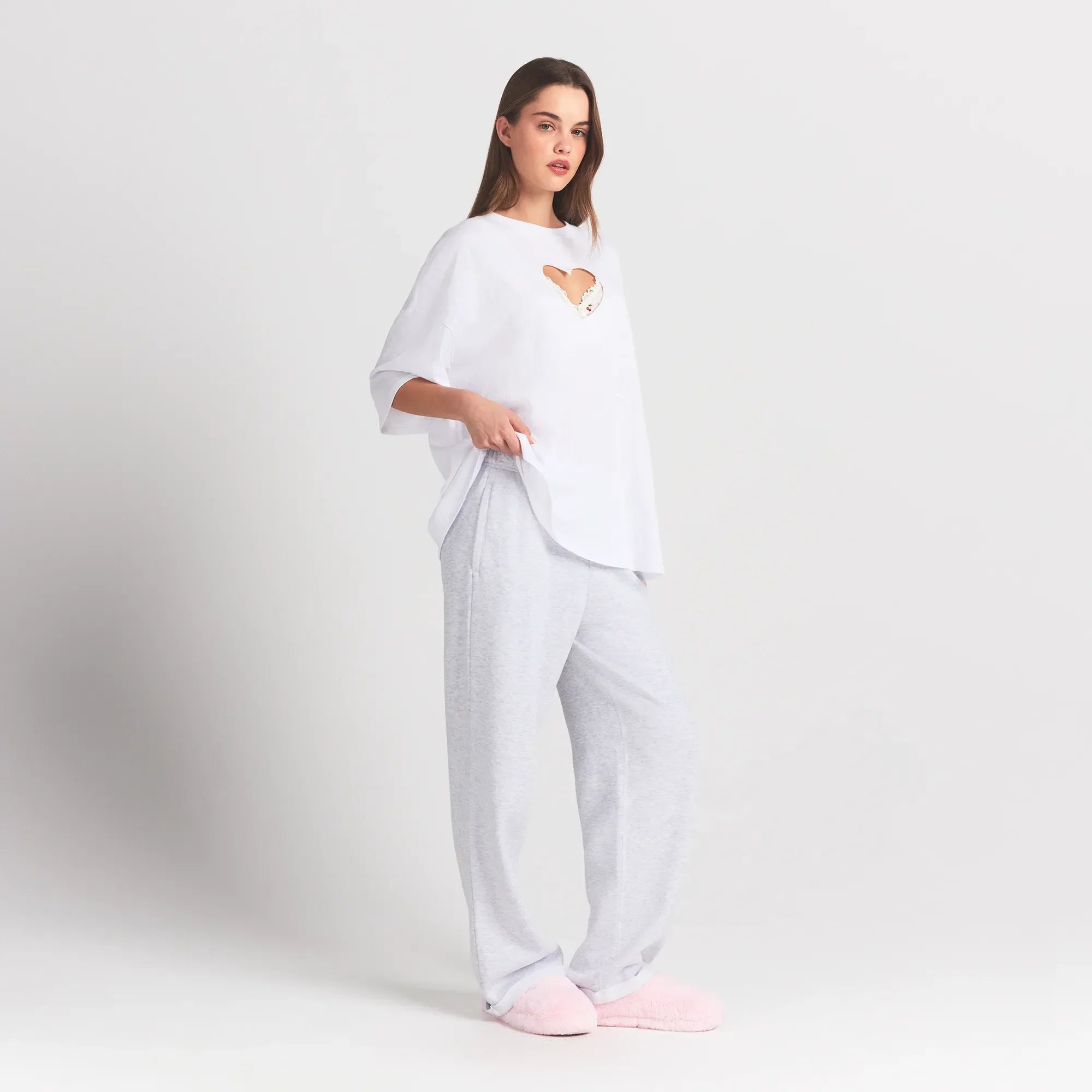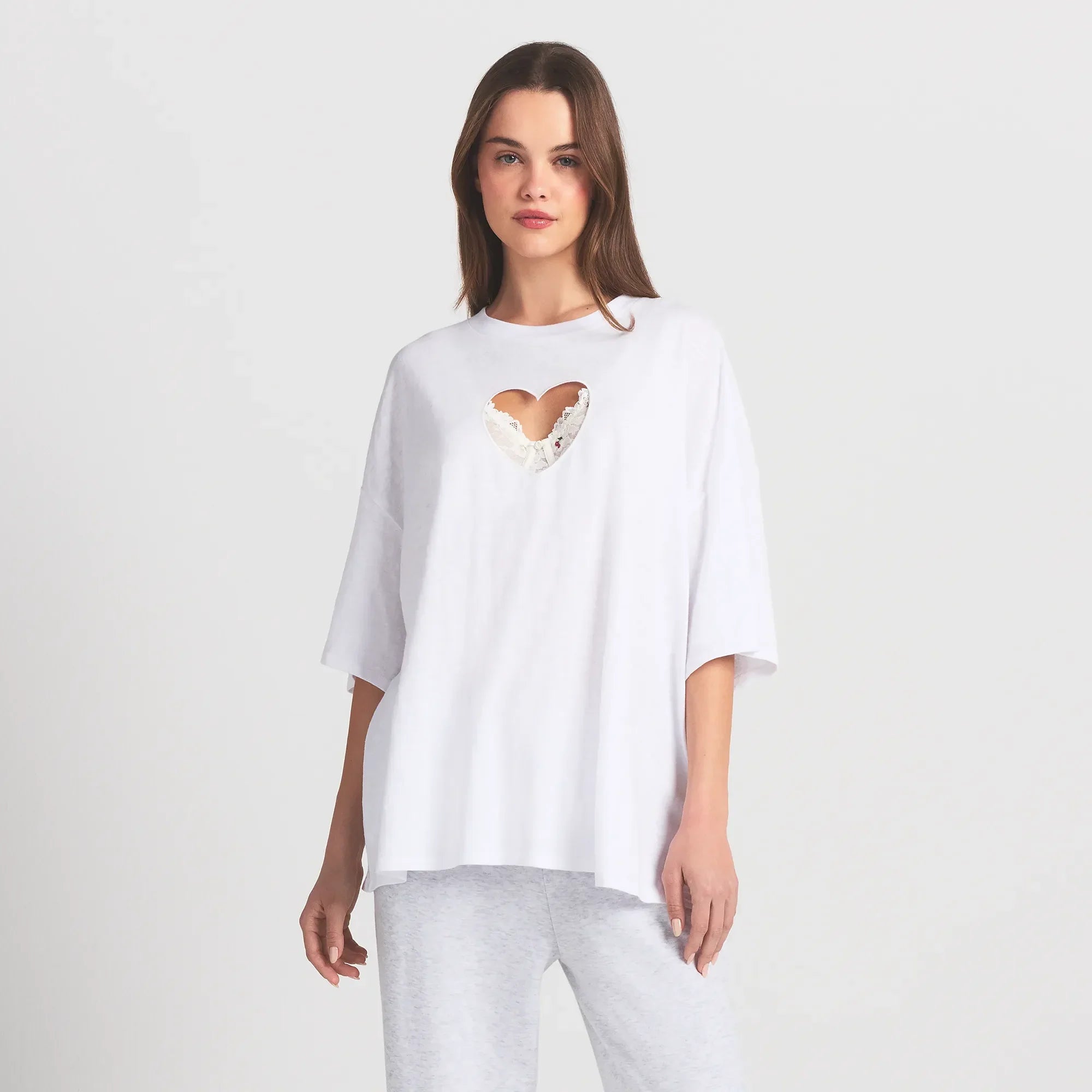 Bu yumuşak overBeden tişört, %100 pamuktan üretilmiştir ve hafif bir dokuya sahiptir. Kalp şeklindeki kesimi ve düşürülmüş omuz silueti ile şıklığı bir araya getiriyor.